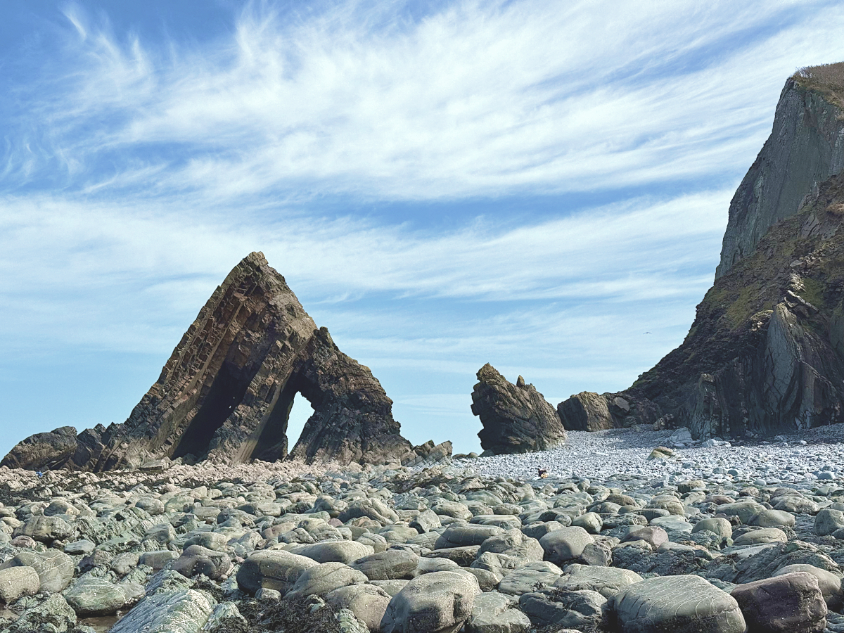 As you walk out onto the rocky shore you’ll encounter Blackchurch Rock, emerging from behind the East headland. It’s an awe inspiring sight, towering and elegant, much bigger than it appears in photos. If the tide is out, you can approach Blackchurch Rock and inspect it up close, even climbing through its gravity defying arches. When out on the coast always keep an eye on the tide to avoid getting stranded.