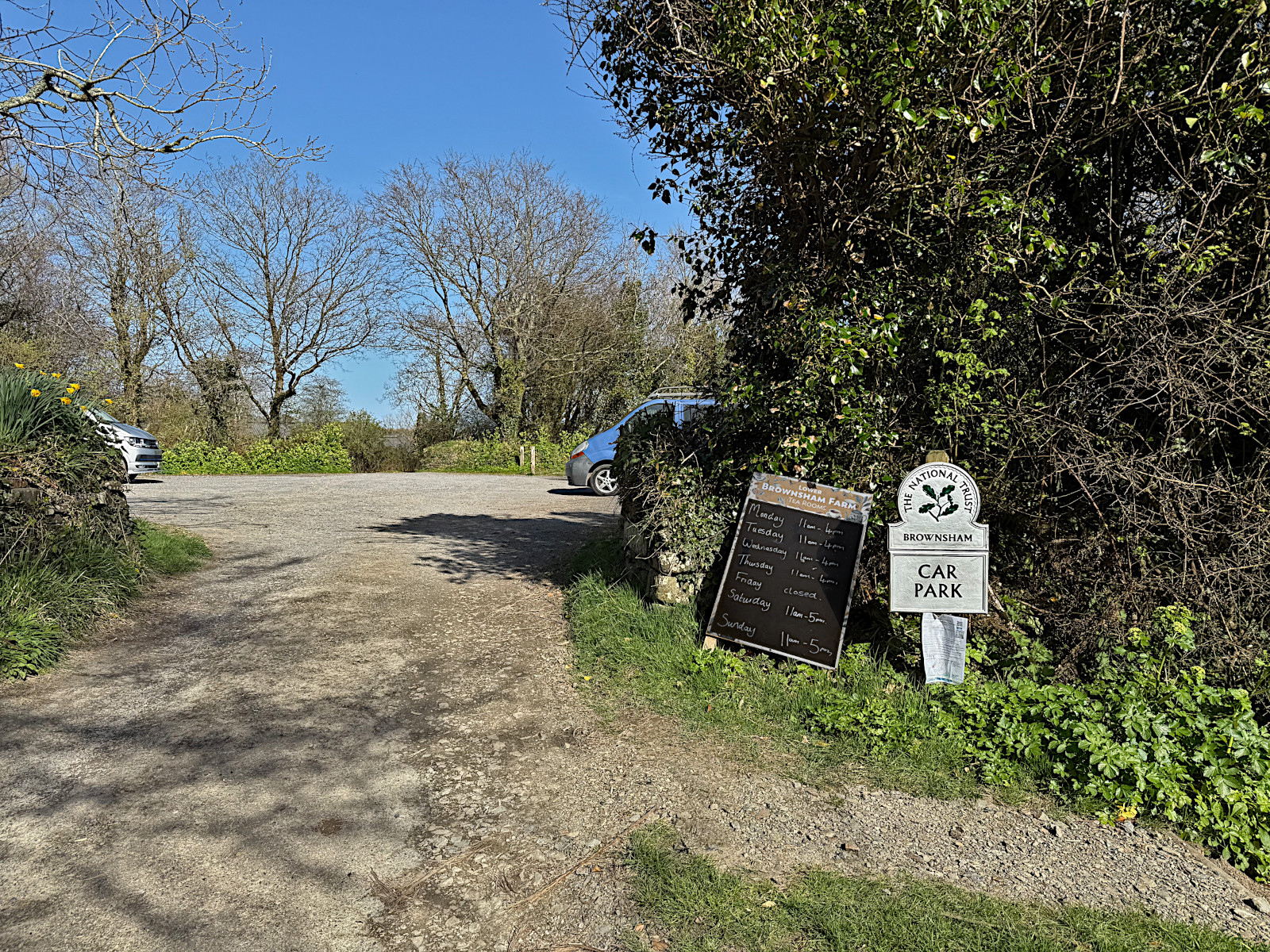 The footpath from the National Trust operated car-park at Brownsham is the easiest way for walkers to reach Mouthmill Beach. The car park is free and has a coin slot donation box. The path is generously wide and descends gently and predictably down a steady 8% gradient through Brownsham woods. In Brownsham there is a former cow shed which has been turned into a National Trust operated Bothy which can be booked online. Current prices are between £25 and £50 per night.