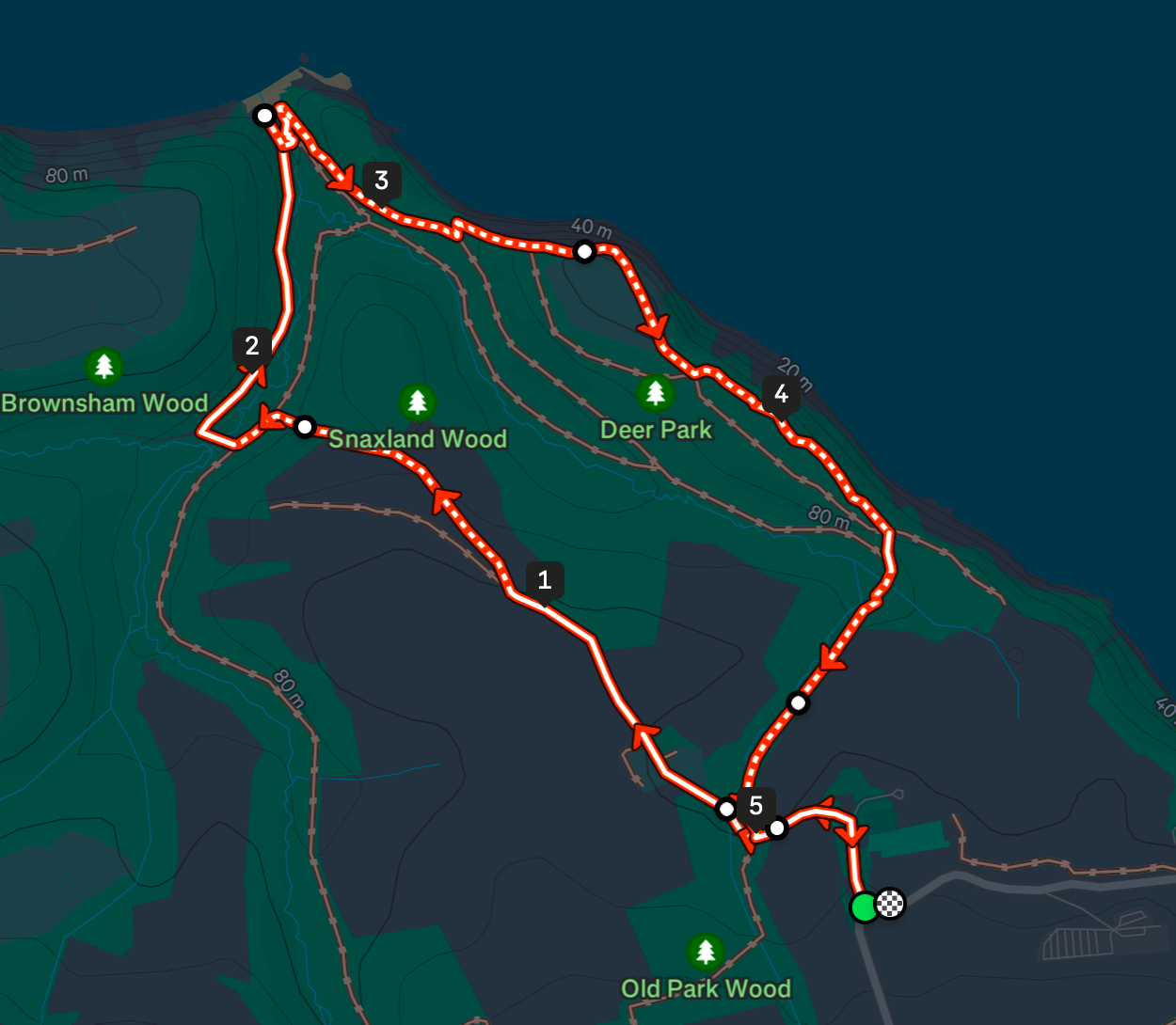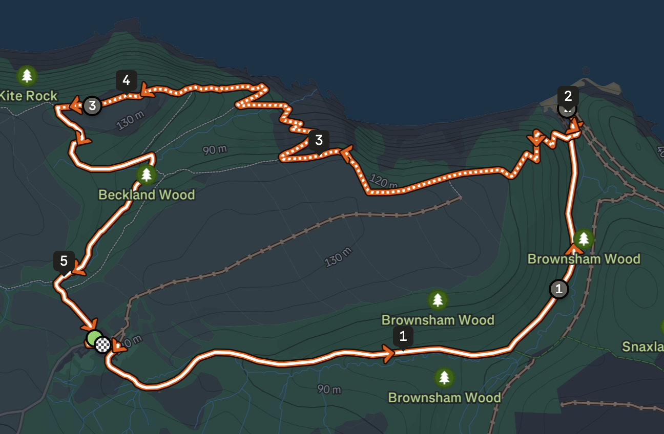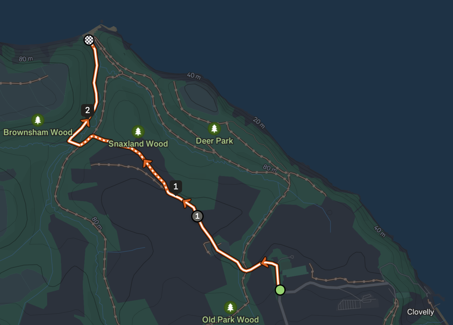 This route through Clovelly Court gardens and a game farm is difficult, but there are lots of way points to visit on the way back. There is the lookout point, cottage and cave in The Wilderness. At the top of the hill a burial mound named "Gallantry Bower", and the Angel Wings shelter to the East.