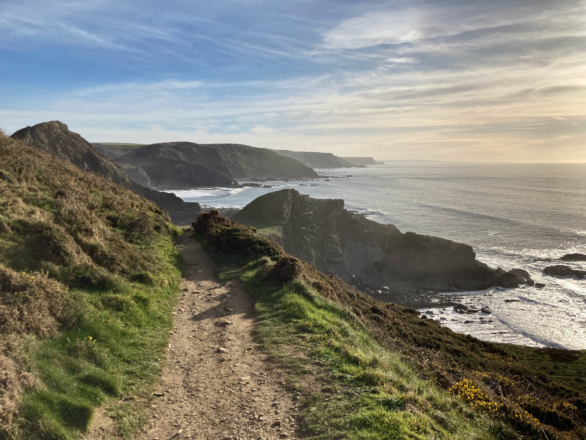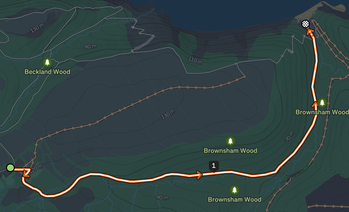 The footpath from the National Trust operated free car-park at Brownsham descends gently and predictably down a steady 8% gradient through Brownsham woods. After visiting Mouthmill Beach, the route takes in Windbury Hillfort to the west, arriving back at the car park from a northerly direction. The return leg of this route is extremely challenging and contains many steep climbs and descents.